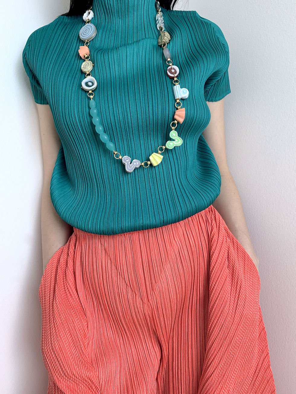 Metaphorically, as it names refers to a jar to store candies, a necklace entitled "Stone Candies" is kept inside. Twenty pieces of carefully selected gemstones were hand-carved to evoke flavours and spice-up the wearer's neck with a tasty touch. Interconnected by 18 kt gold plated silver rings, each gemstone has been hand carved emulating a candy look, with a reminiscence of classical architecture ornaments: columns, balustrades, rosettes, glyphs and other shapes could be identified along with the piece: A wink to the pop culture and the classic legacy.